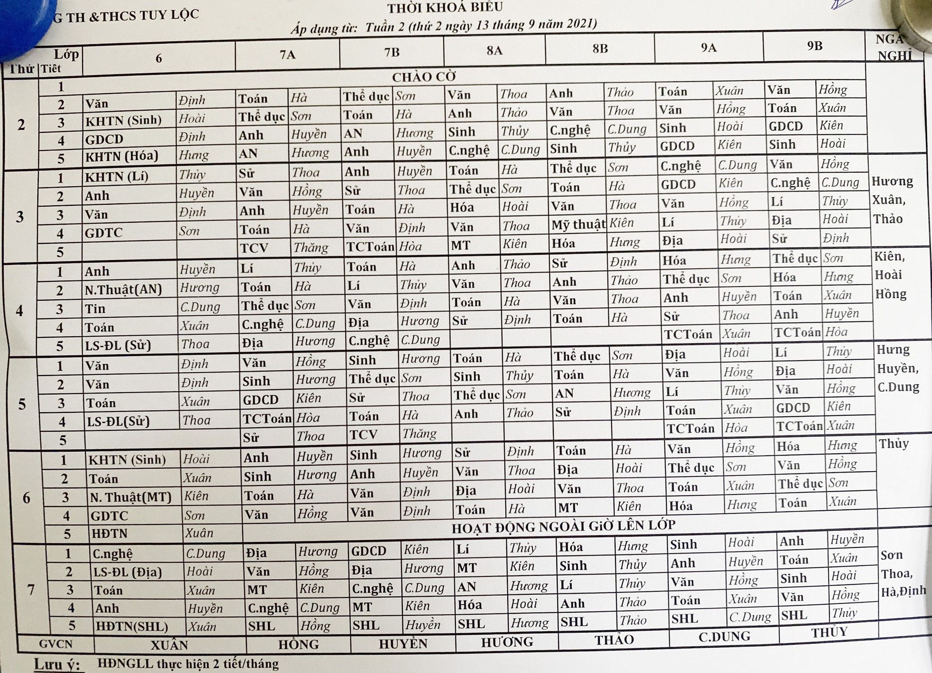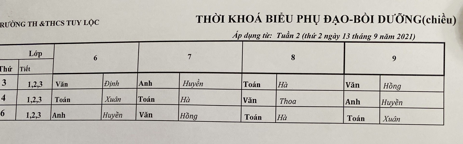Thời khoá biểu bậc THCS