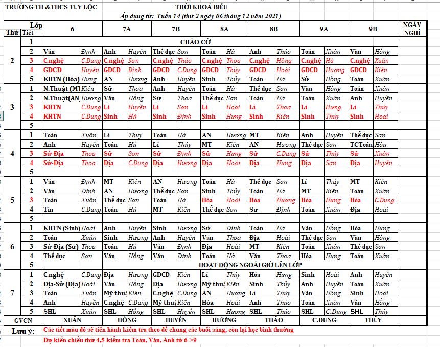 Thời khoá biểu bậc THCS thực hiện từ tuần 14